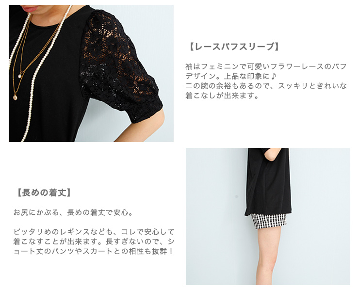 トレーナー素材で着やすく、カジュアル♪レースの大きめパフスリーブがキュート!!カジュアルな...